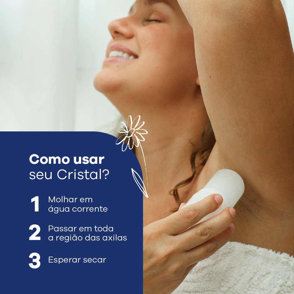 Com apenas um ingrediente natural, o Cristal Alva elimina as bactérias responsáveis pelo odor. Nada de manchas na roupa, e uma proteção natural e saudável por 12 horas!